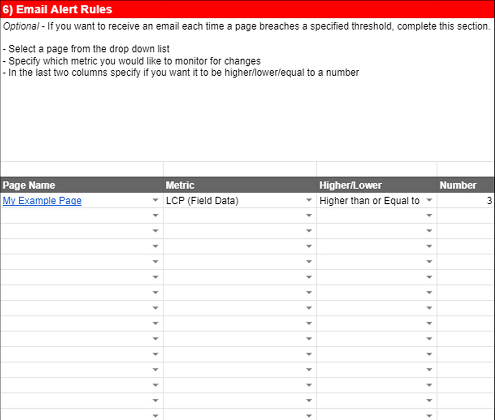 This should hopefully be quite self-explanatory. You need to enter the Page Name via the drop down list (this just pulls in all of the pages you have created in the Page Analysis section from the Settings sheet), the metric you wish to track, and how you wish to track it.