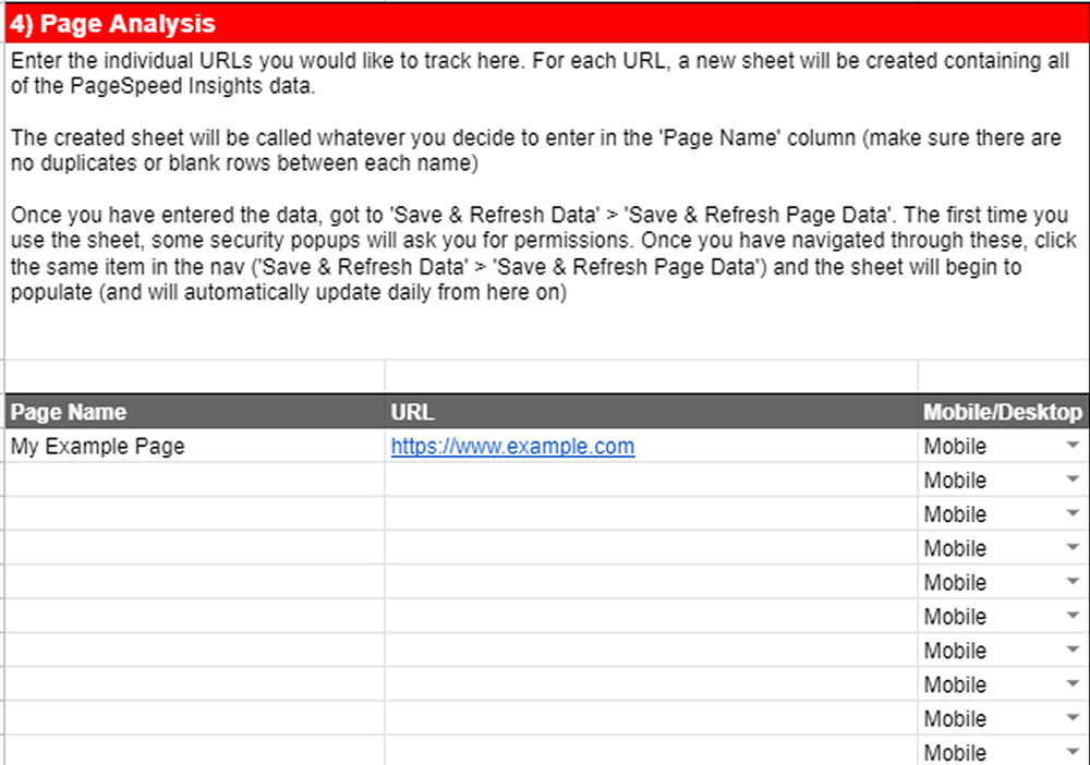 Start by navigating to the ‘Page Analysis’ section of the sheet. For each URL you want to track, provide the following information: